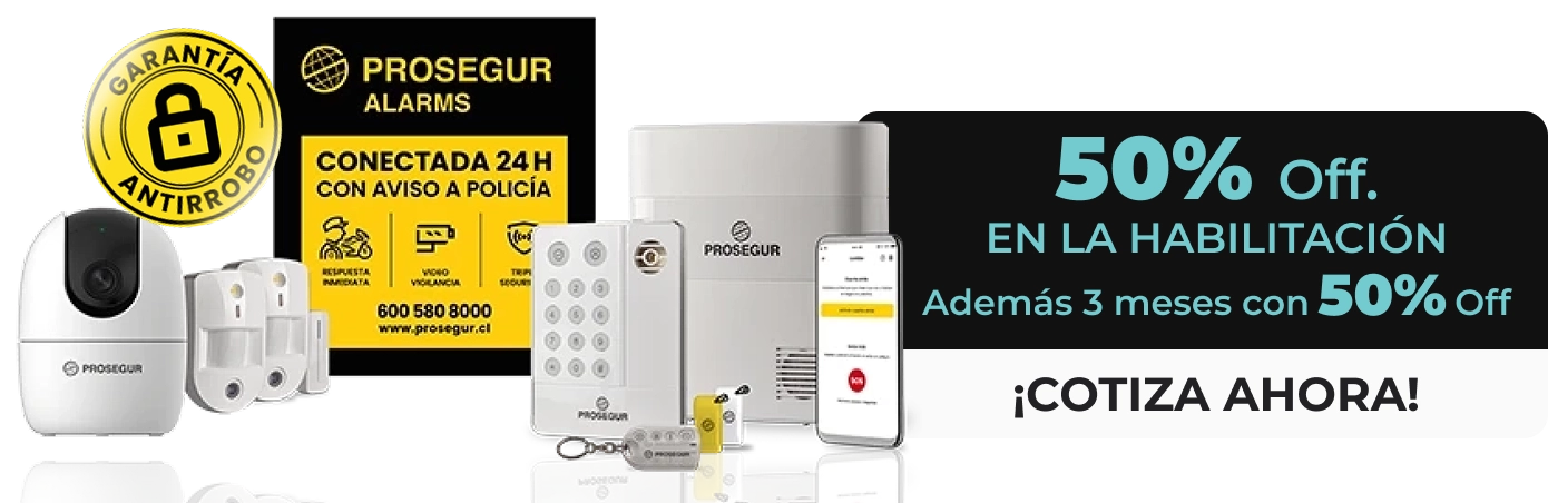 Oferta válida para personas naturales o jurídicas, clientes nuevos o para servicios en un inmueble distinto al actual de clientes vigentes de Prosegur Alarms, que contraten hasta el 31 de Diciembre del 2026 inclusive, contratando el PACK PLUS de Alarma hogar o negocio. Servicio disponible en el territorio continental de la República de Chile, excluidas las regiones de Arica y Parinacota, Tarapacá (salvo Chañaral) y Aysén. Valido solo suscribiéndose a medio de pago PAT/PAC.